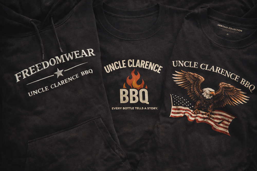 Uncle Clarence BBQ apparel is built the same way we build everything else — with long-term standards and earned pride. These collections are designed for everyday wear, structured for durability, and grounded in identity. From Freedomwear and Heritage to Legacy, hats, and aprons — every piece carries the name with intention.